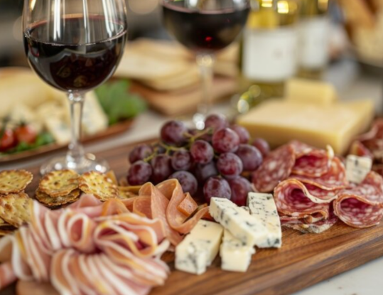 A cheese and charcuterie board requires no cooking. The salt, protein, and fat in the cheese and meats are a good match for wines with higher tannins such as oaked Chardonnay or a Cabernet Franc or Cabernet Sauvignon.